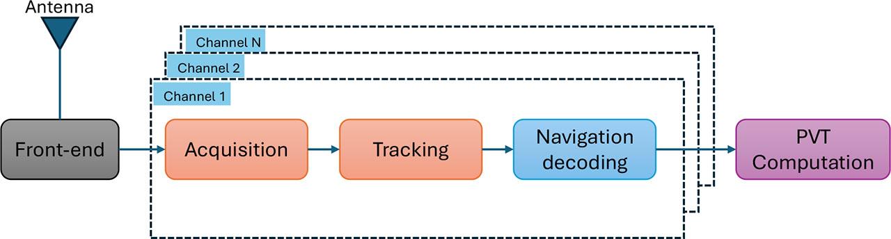 The final block, PVT computation, computes the navigation solution for the receiver.