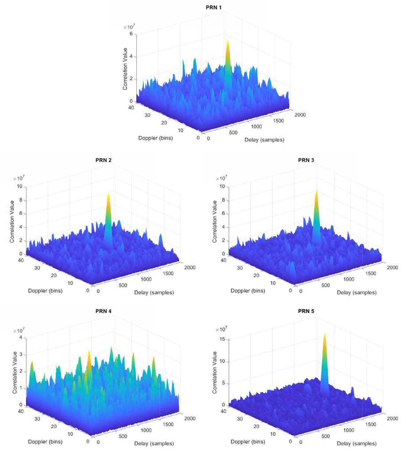 During the acquisition stage, the uncertainty regarding the availability of specific satellites and the extent of Doppler shift and code delay require a comprehensive search across all possible values of code and Doppler frequency. This is achieved by generating a local code and carrier signal and then performing a correlation with the received signal. If a satellite is present, a prominent peak will emerge above the ambient noise, as illustrated in PRNs 1, 2, 3, 5, 7, 9, and 10 (Figure 8). In contrast, if no satellite is available, the correlation result will only show ambient noise, as depicted with PRNs 4, 6, 8, 11, 12, 13, and 14.