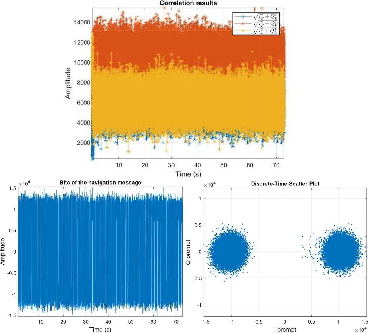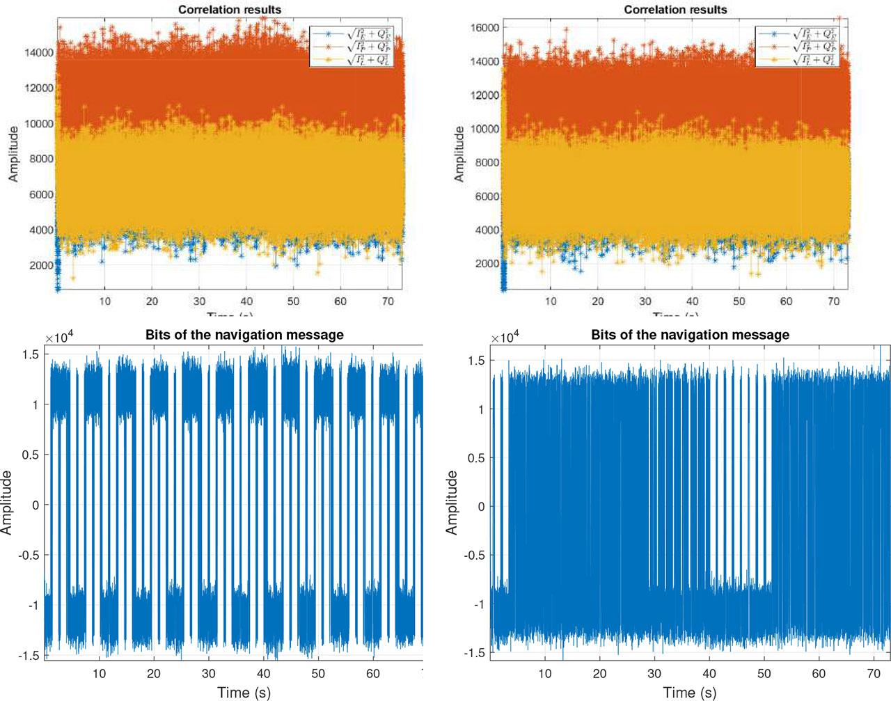 We found very interesting information about satellites PRN 5 and PRN 7 of the NavIC signal. Even though these satellites could be acquired perfectly as shown in Figure 8, there are no navigation messages in the navigation bit after the tracking phase. Figure 12 shows the tracking results of PRN 5 and PRN 7 and we can see a strange pattern of navigation message bits.