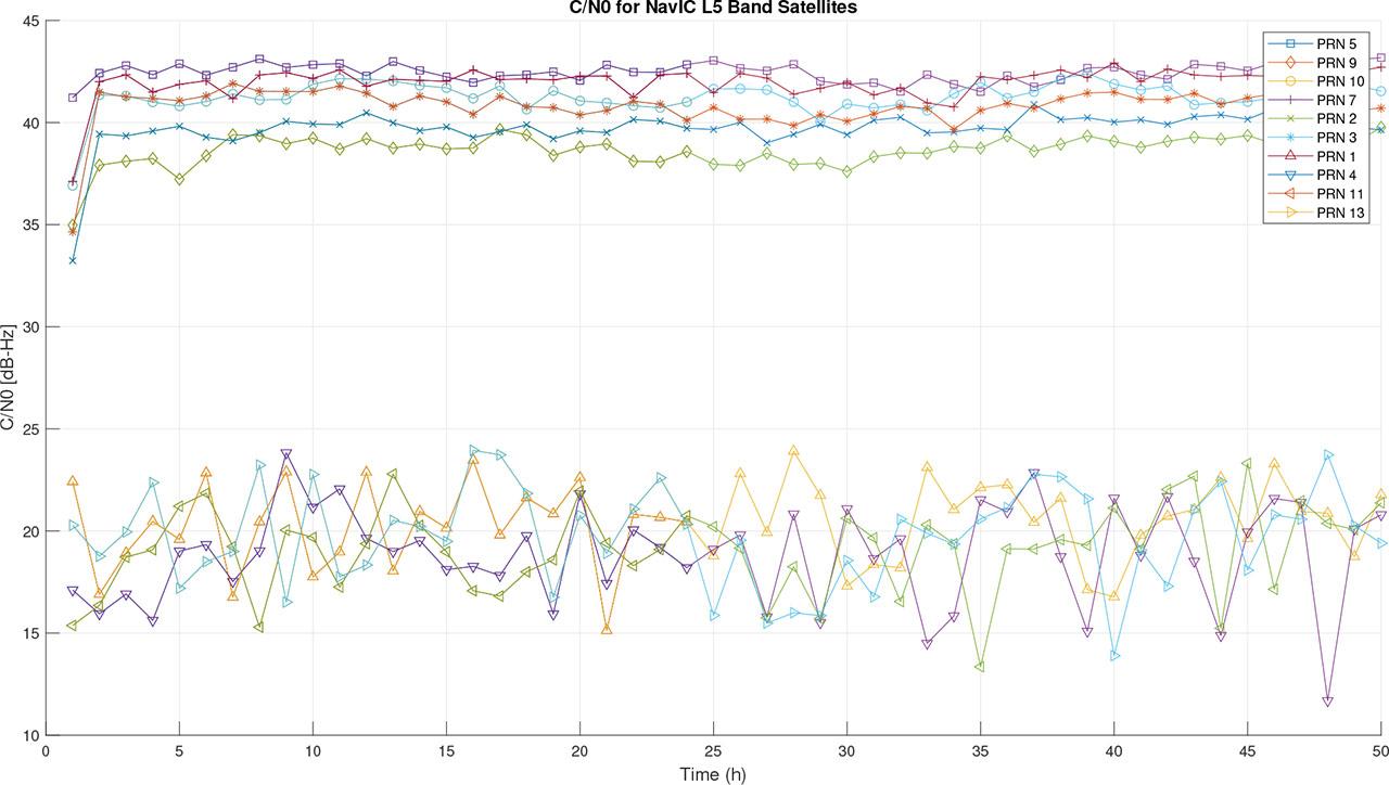 As shown in Figure 10, the figure illustrates the Carrier-to-Noise Density Ratio (C/N0) for the NavIC L5 band satellites, capturing signal strength variations under low-elevation and low-SNR conditions as observed in Vietnam. The results show that while some satellites maintain relatively high C/N0 values, others display significantly lower levels, leading to varying tracking performance across satellites.