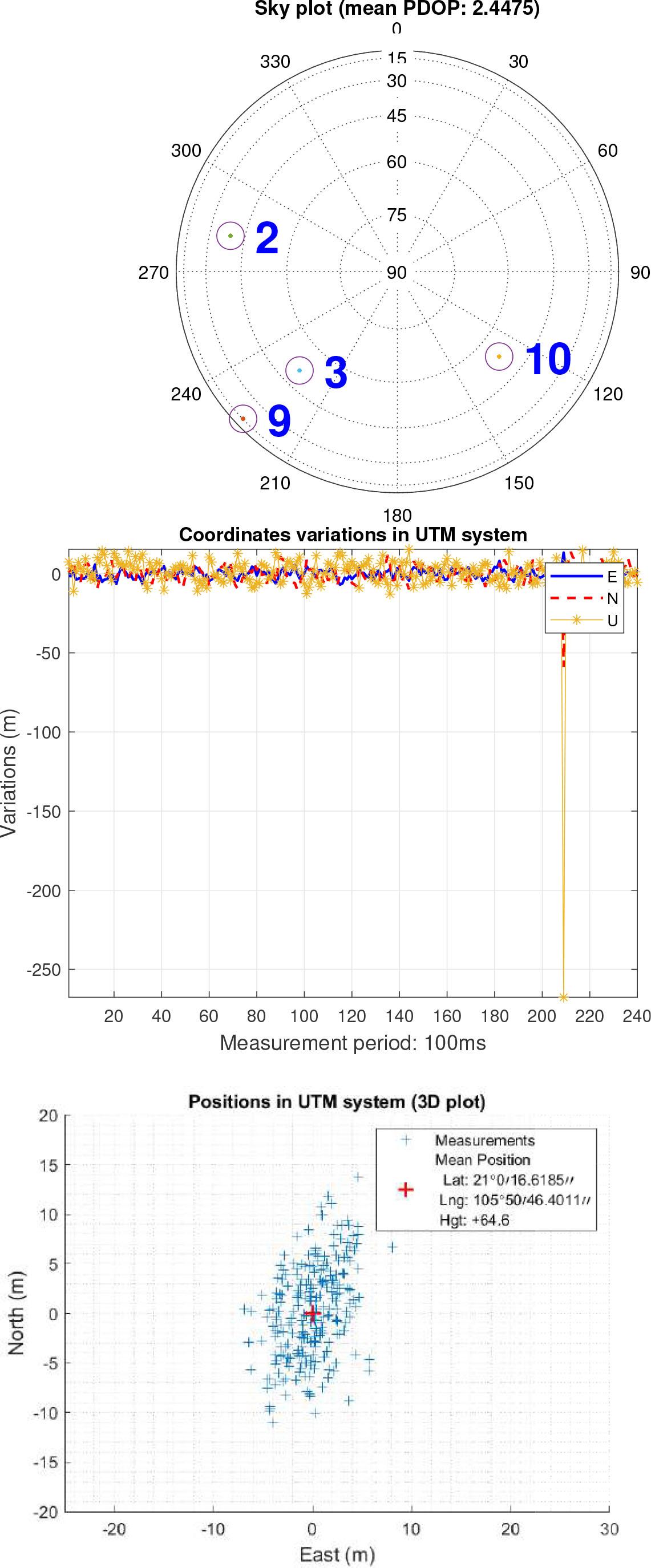 The scatter plot shows a dense clustering of positional measurements around the mean position, with a horizontal spread of approximately ±10 meters. This tight clustering is indicative of reliable horizontal positioning accuracy, affirming that the SDR receiver can sustain accurate positioning using IRNSS signals, even in a low-elevation, low-SNR environment. This result proves the system’s capability to deliver consistent navigation performance suitable for general applications in Vietnam.