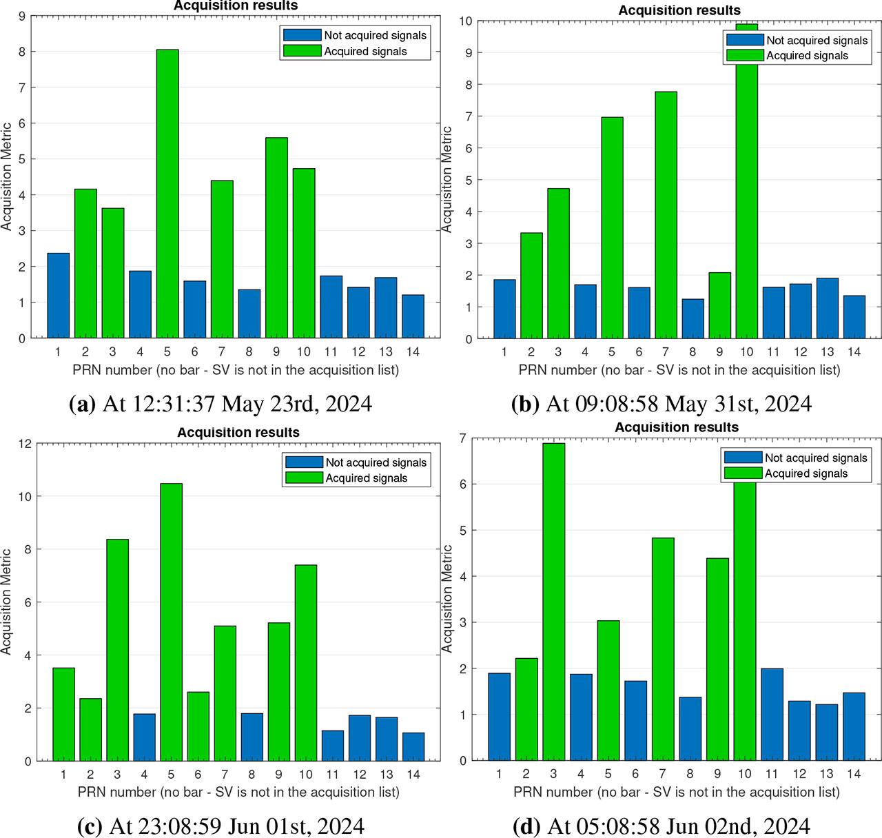 Across all four subplots, the visible satellites (indicated by green and blue bars) remain consistent. This is evident as the same PRNs are observed in each acquisition attempt, confirming that the receiver detects a similar set of IRNSS satellites during each observation. This consistency suggests that the receiver is operating within a stable coverage area for IRNSS, with predictable satellite visibility patterns in this region.