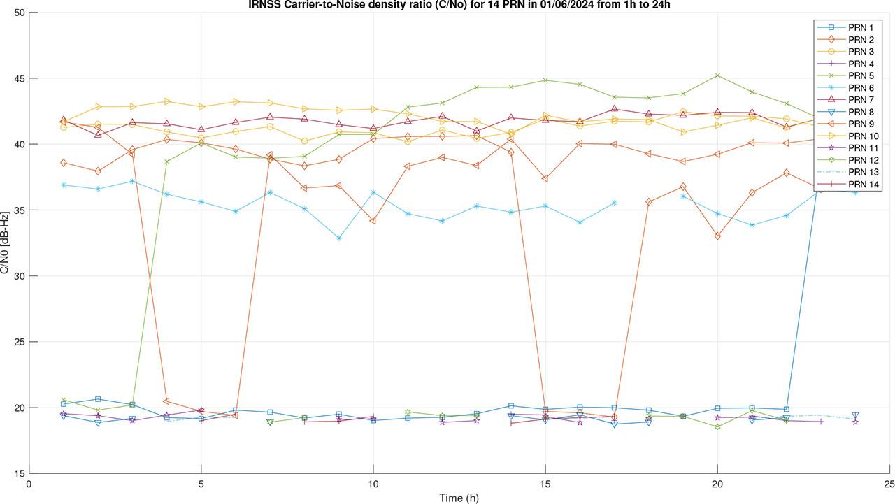 The chart in Figure 15 displays the Carrier-to-Noise Density Ratio (C/N0) for 14 IRNSS satellites over a 24-hour period on June 1, 2024. The results highlight variations in signal strength across different satellites and time, reflecting the impact of satellite geometry and environmental factors on signal quality.