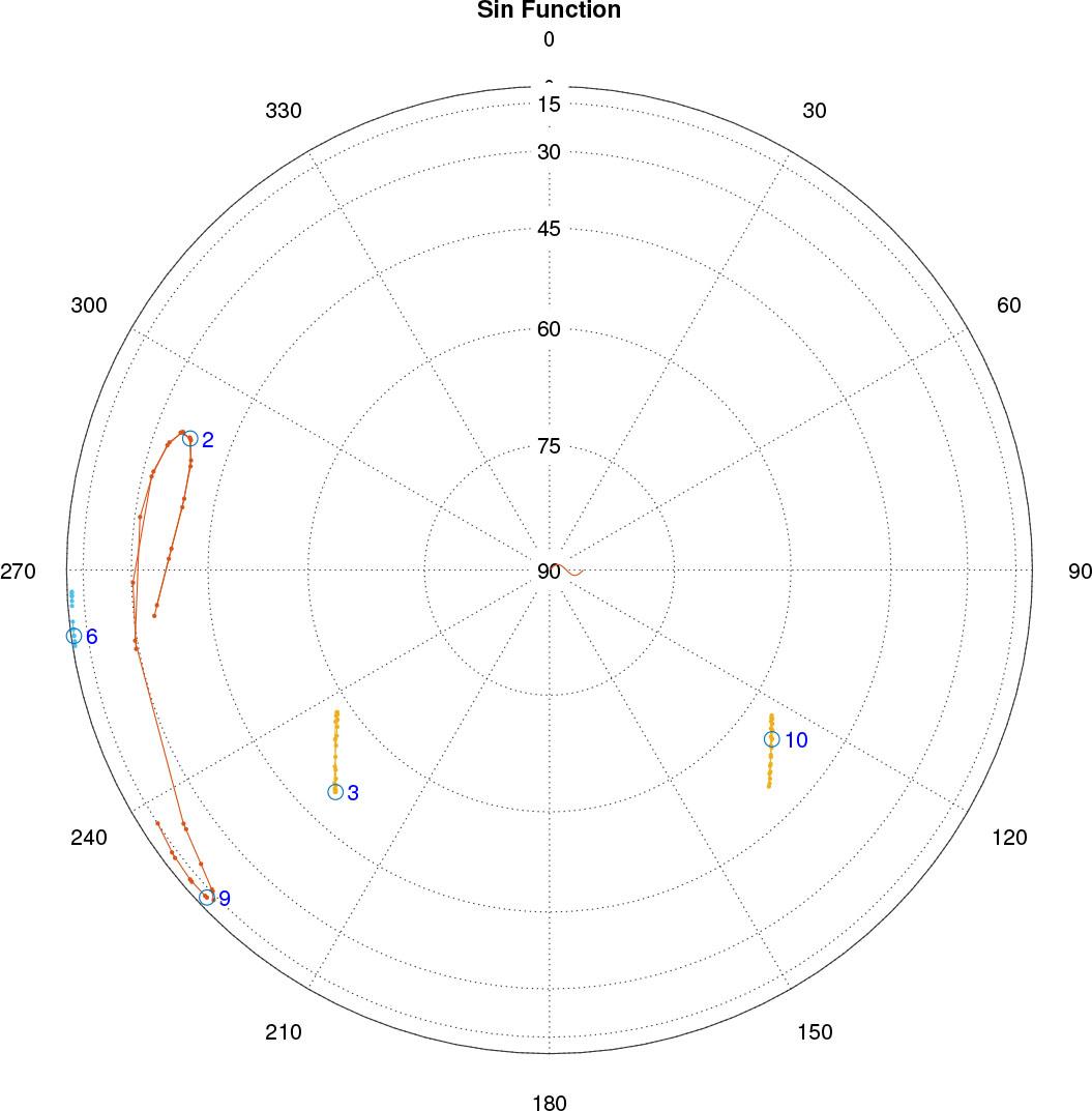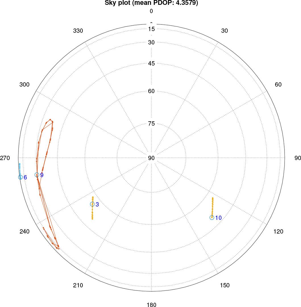 The plot reveals that the majority of the satellites are positioned at low elevation angles, particularly along the southwestern and southern horizons. PRNs 2, 6, and 9 appear to have extended trajectories near the horizon (elevations below 30 degrees). Low elevation angles generally result in lower C/N0 values due to increased atmospheric attenuation and multipath interference, explaining the weaker signal strengths observed in the C/N0 chart for these satellites.