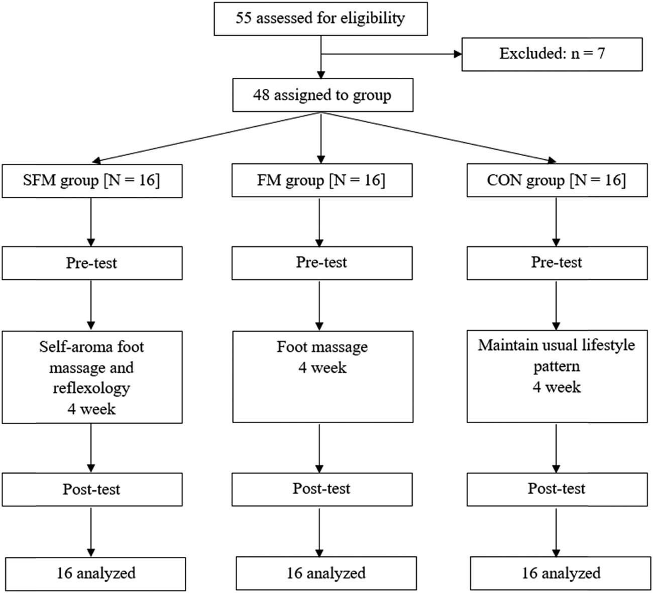A total of 48 hypertensive patients were randomly assigned to one of three groups, each consisting of 16 participants: the self-foot massage and reflexology combined with aromatherapy group (SFM), the foot massage group (FM), and the control group (CON). Each intervention session lasted 15 min, with a frequency of three sessions per week (Figure 1).