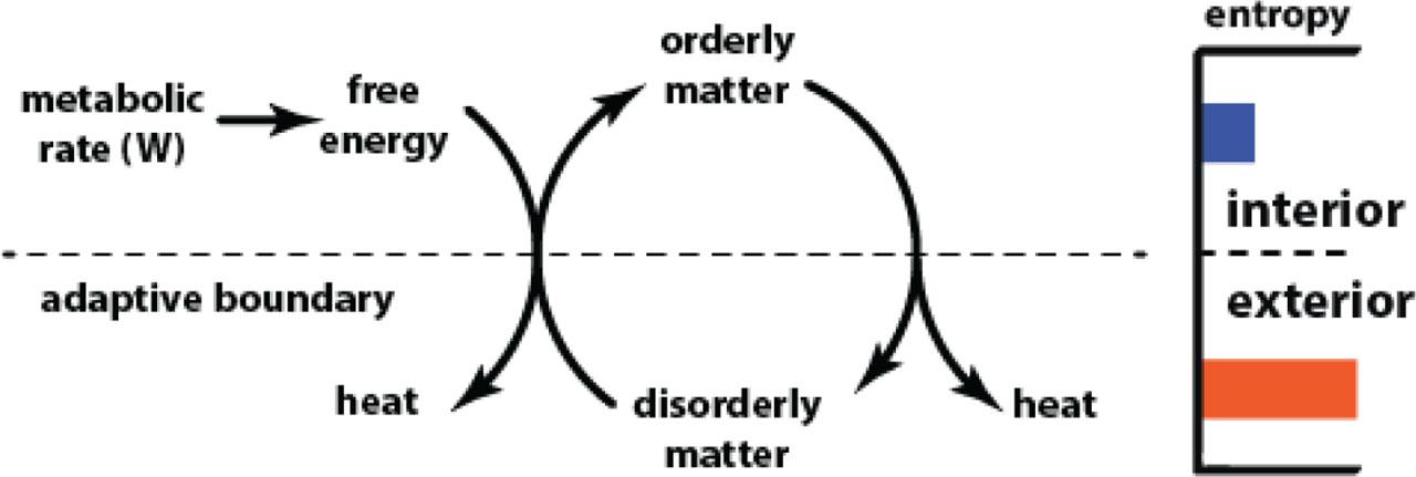 The persistent dynamic disequilibrium. Free energy drives a movement of disorderly matter across an adaptive boundary and does work to organize it into the specified dynamic disequilibrium of the organism. At the same time, the orderly organism degrades spontaneously to disorder.