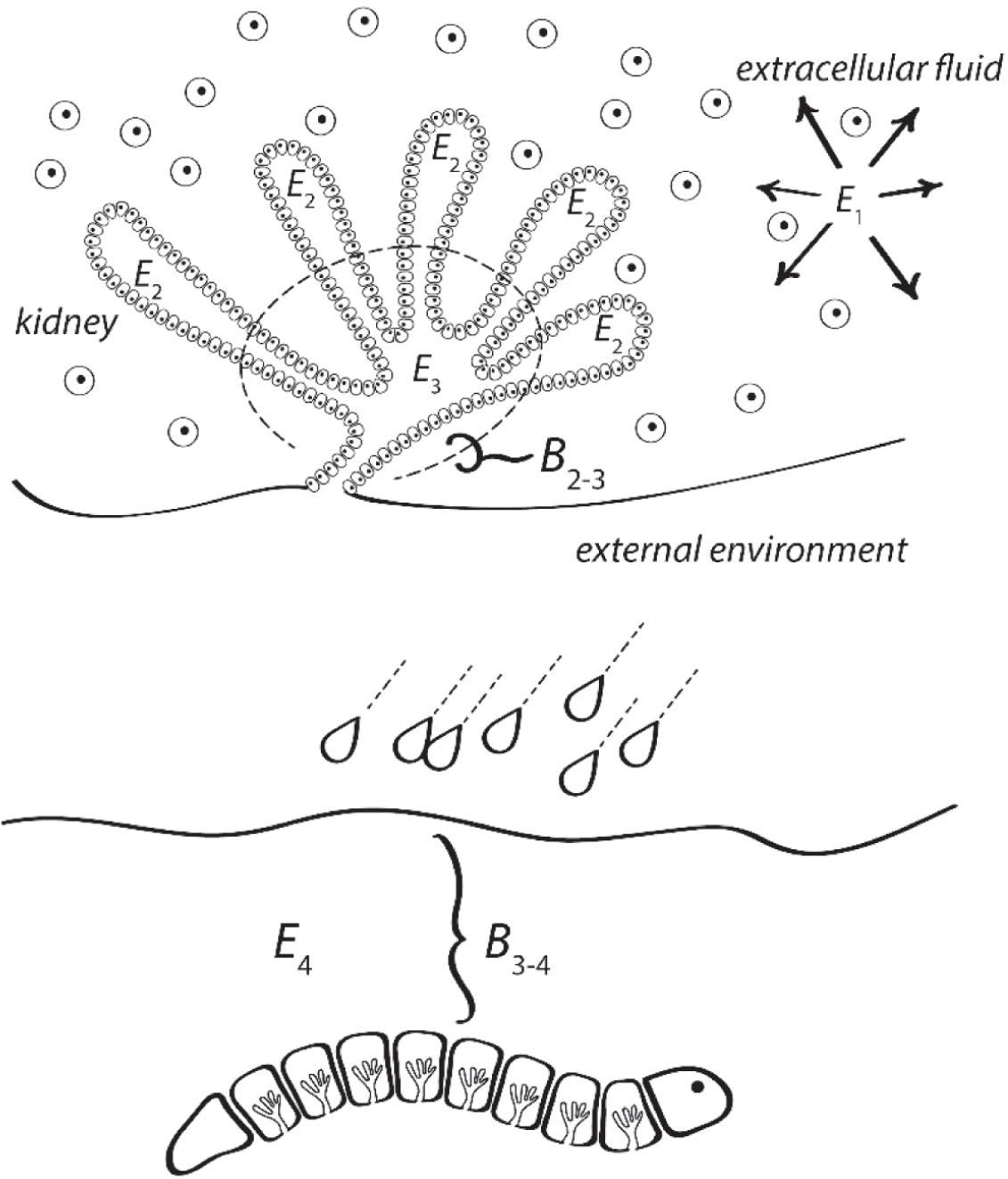 The nephridium manages the earthworm's internal water balance in the face of variation in the external environment's water availability. It does so by creating a hierarchy of nested sub-environments, each delimited by an adaptive boundary. The cells living within the worm's coelomic fluid are bounded by the cell membrane (designated B0–1), dividing the intracellular environment (designated E0) from the environment of the extracellular fluid (designated E1). The nephridium epithelium itself is structured to form additional sub-environments within the nephridial tubules (E2), which together create a new environment (E3) within the nephridium bladder. The ultimate segregation of environments occurs at the integument, which is the interface of the earthworm organism and the soil environment in which it lives (E4). Each sequestration of environments (E0, E1, E2, E3, E4) is through a hierarchy of nested adaptive boundaries (B0–1, B1–2, B2–3, B3–4).