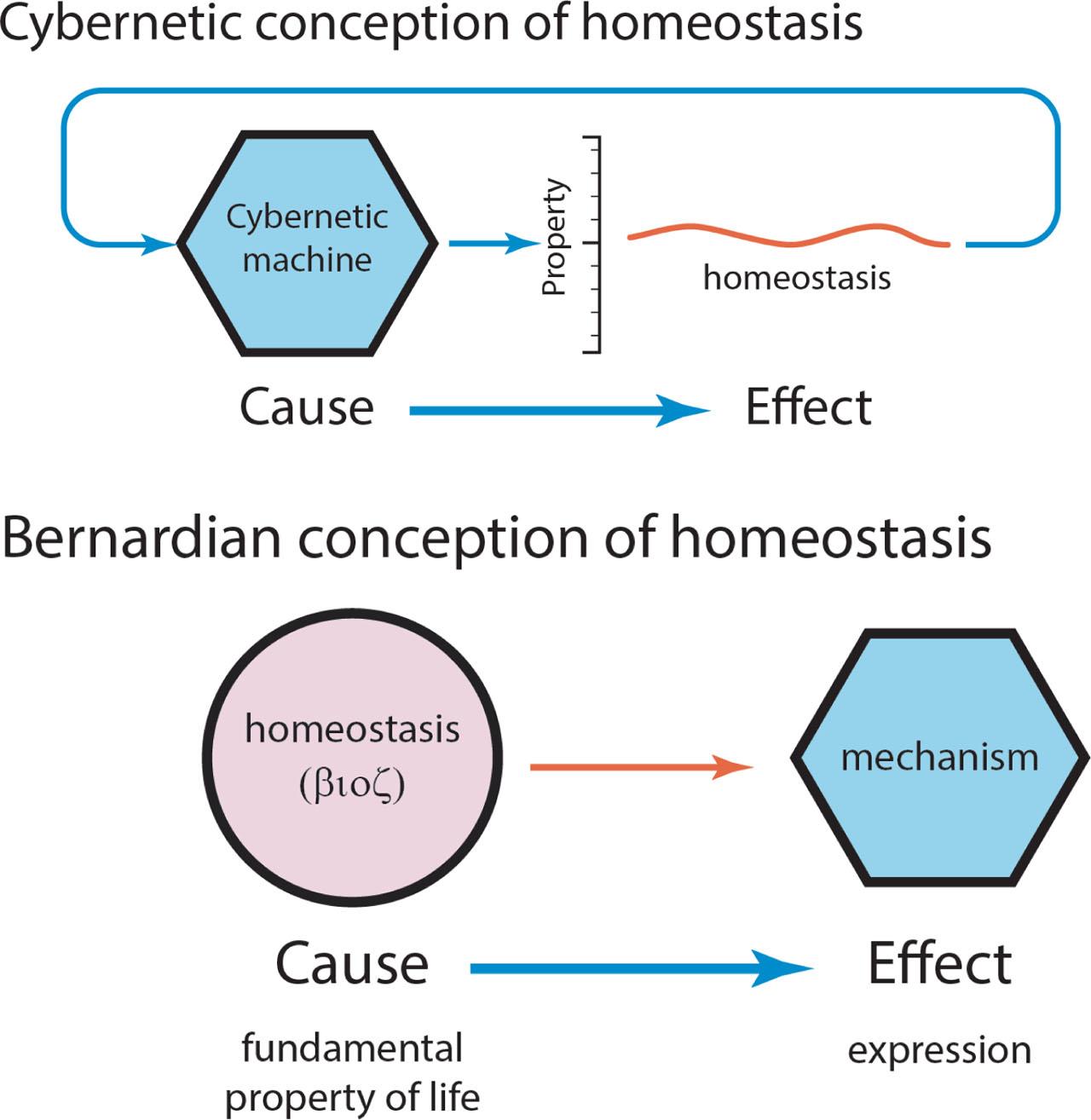The cybernetic metaphor for homeostasis is more than an analogy: it is a particular statement of cause and effect. The regulated property is the effect, and the cybernetic machine is the cause. Bernard's conception of homeostasis is in fact the inverse of Wiener's (Figure 6). To Bernard, homeostasis was the fundamental principle that distinguishes life from non-life. While Bernard's great skills as an experimentalist and empiricist allowed him to tease out the details of the mechanisms behind the steadiness of the internal environment, Bernard was nevertheless a ‘small-v vitalist’, in that he regarded life as distinctive in some fundamental way from non-life. His famous aphorism expresses this: the ‘steadiness of the internal environment’ is the predicate for the ‘free and independent life’ (13). The inversion is crucial: being life's fundamental quality, homeostasis is not derivable from mechanism. Rather, the mechanism is the outcome of life's fundamental quality: homeostasis is now the cause, and the mechanism is the effect.
