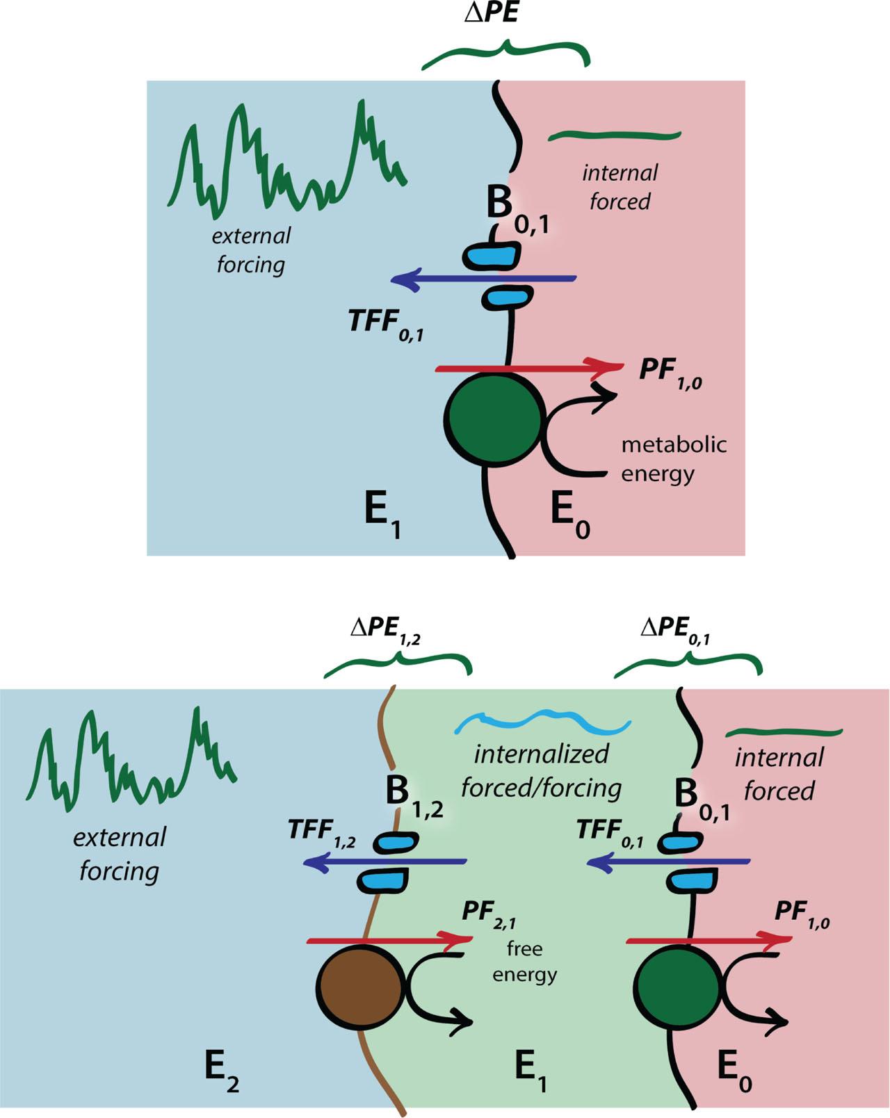 The signal of extended homeostasis can be difficult to discern if it is overwhelmed by strong forcing by external environments (Figure 6). If the forcing from the external environment fluctuates rapidly and chaotically, as it would likely do if the environmental forcing is strong, this will impose commensurate large and unpredictable metabolic demands on the adaptive boundary (Figure 7, top). These can be ameliorated by nesting adaptive boundaries within one another. By nesting B0,1 inside a new adaptive boundary (B1,2), E1 now becomes an internalized ‘external’ environment, managed by B1,2, so that the metabolic demands on B0,1 are ameliorated and damped (Figure 7, bottom).