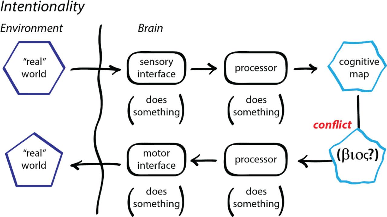At root, homeostasis is a cognitive phenomenon. The adaptive boundary is a sensory interface, which senses environmental circumstances, and maps that information onto some internal cognitive representation of the environment. This cognitive map is then compared to the organism's self-knowledge of what it intends to be (Figure 9). The adaptive boundary is also a motor interface, doing physical work on the external environment, shaping it so that the ‘real world’ is brought into conformity with the βioς. This is intentionality: the organism intends to create an external environment that is suitable for sustaining the βioς (15, 38,39,40). Simple adaptation follows when the cognitive map tracks the ‘real world’ as it changes, and directs the motor interface to shape the real world, again with the aim to sustain the βioς, that is, the persistent thermodynamic disequilibrium that is the organism. This is adaptation as frank, not apparent, intentionality.