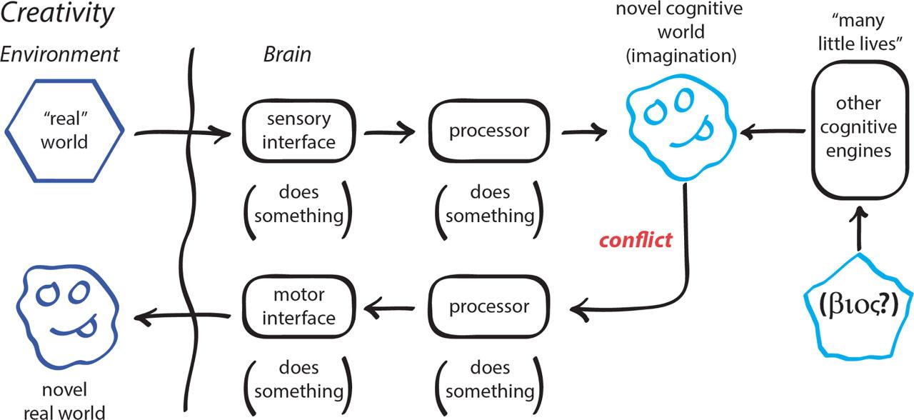 Cognitive maps also may be shaped independently of direct inputs from the sensory interface. There may be inputs from other cognitive and adaptive systems within the organism (Figure 10). In this circumstance, cognitive maps can arise that are decoupled from a direct sensory inputs: imagined, in a word. Creativity emerges when the motor interface works to create a ‘real world’ that conforms to the imagined cognitive representation. Novelty is the product of intentional creativity.