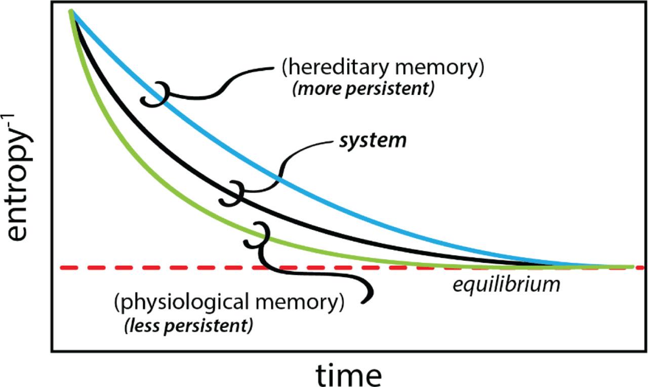 Memory is not only a remembrance of the past, it is a means of biasing the future. The strength of a memory is determined both by how strong the future bias is, and by how far into the future the bias extends. Like life itself, process memory is subject to the same dynamics of disequilibrium, of creation and expression balanced against thermodynamic decay. Process memory therefore operates on a continuum, from very short, which may be termed physiological memory, to long, which if long enough, may be termed hereditary memory (Figure 11). Where the one transitions into the other will depend upon context. The cell, for example, is a low entropy state that is subject to a particular rate of thermodynamic decay (the TFF, Figure 3), and that persists as long as order-producing work can be done to offset it (the PF, Figure 3). An enzyme complex may shape function for only a few seconds, for example, less persistent than the cell itself. Within that context, this is effectively a form of physiological memory. If, on the other hand, the cell constructs an environment that persists for longer than the cell itself, that process memory effectively becomes a form of hereditary memory for the cells that construct it (Figure 11). Working up through the levels of the nested adaptive boundaries that comprise the organism, process memories can be simultaneously physiological and hereditary. If, for example, an earthworm's nephridial epithelium (B1,2, Figure 4) creates an environment (E1) that persists beyond the lifetimes of the cells (E0) living there, the maintenance of E1 is a form of hereditary process memory. Just as the nesting of adaptive boundaries creates newly internalized environments (Figure 7), process memories can be simultaneously physiological and ‘hereditized’ by context.