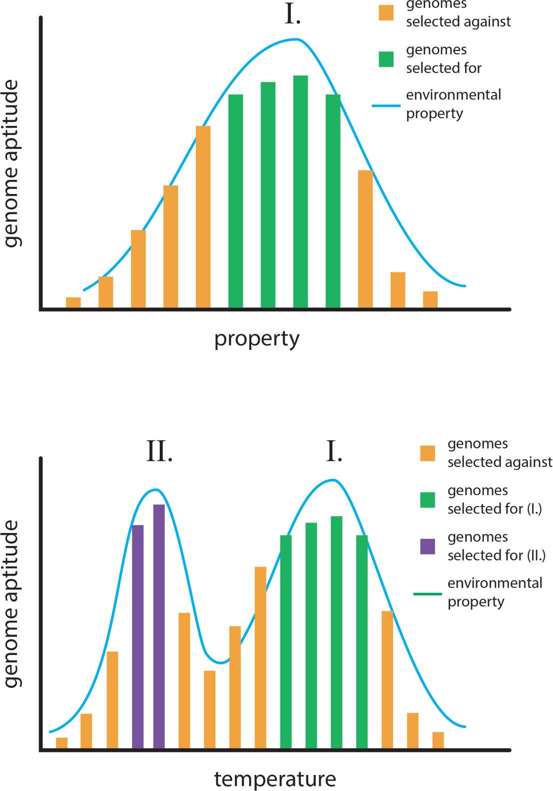 The Neodarwinist model of evolutionary novelty. Top: The centralizing tendency of gene selectionism. In an environment that varies in some property (e.g., temperature), some genomes will confer high aptitude and be selected for (green bars), while some will be less apt and be selected against (orange bars). Bottom: Some genomes that confer inaptitude in one environment (I.) may confer high aptitude in another (II.), and will be selected for (purple bars), producing a novel genome.