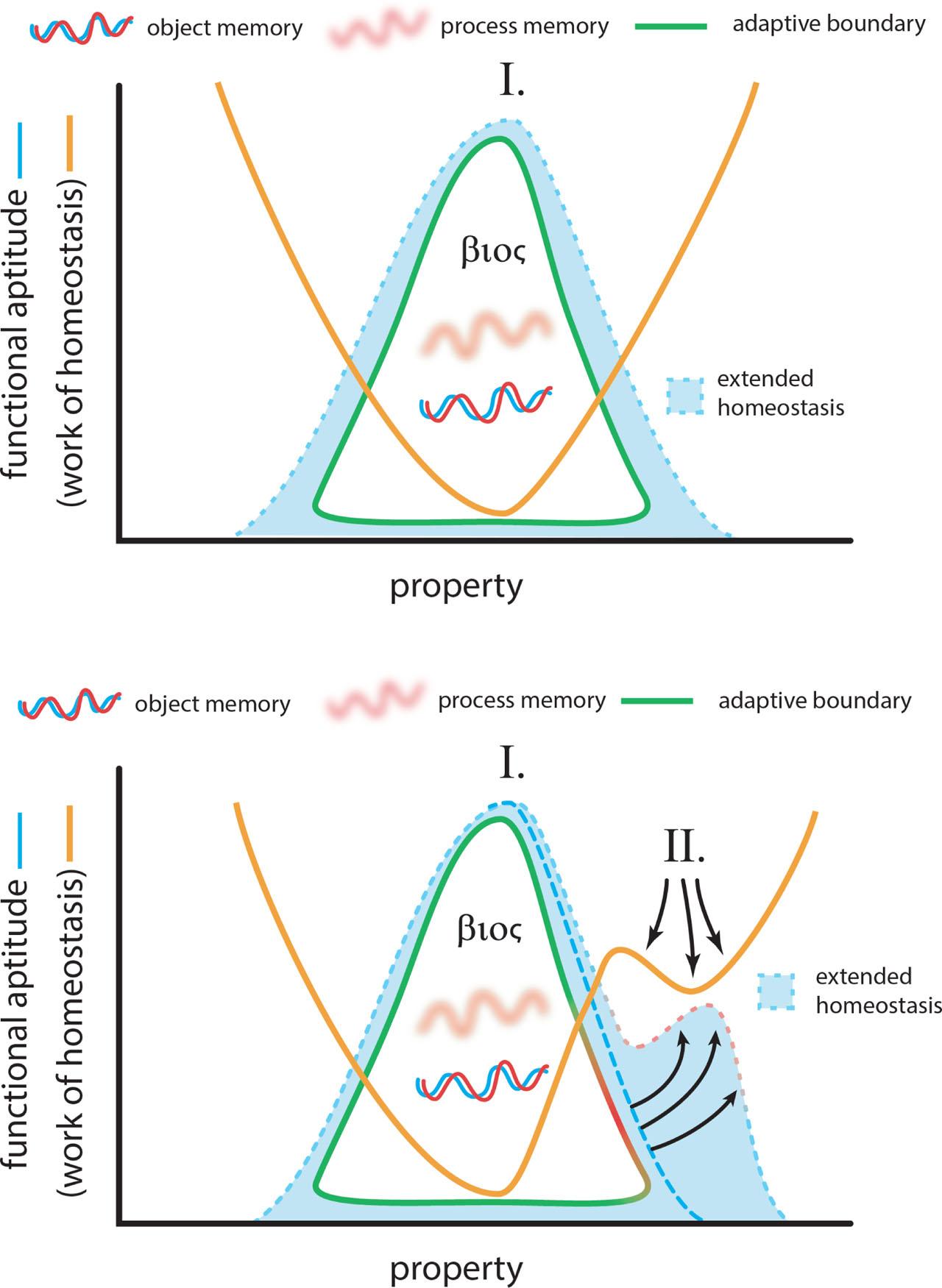 Similar to the Neodarwinist model, functional aptitude in the extended organism model can gravitate toward a minimum for work of homeostasis (labeled I. in Figure 15, top). The difference comes in at the environmental extremes. In the Neodarwinist model, environmental extremes select against inapt genomes. Novelty only arises by the introduction of a new sorting filter, a new environment that selects genomes that were inapt in the original environment. In the extended organism model, environmental extremes offer new opportunities for purposeful striving. By intentionally creating new environments that channel matter and energy toward the organism's specified thermodynamic disequilibrium, the extended organism effectively creates anew a local minimum in the cost of homeostasis (labelled II. in Figure 15, bottom). Novelty in this circumstance arises at the environmental extremes, in the form of intentional goal-directed modification of environments, the goal being persistence of the βioς. Novelty becomes evolutionary novelty when these intentional modifications outlast the extended organism and verge into hereditary memory (Figure 11).