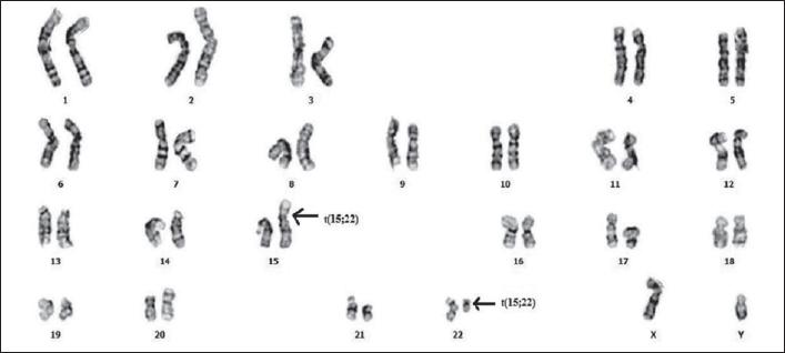 This translocation is different from the usual ROB of acrocentric chromosomes. The satellite region of chromosome 15 translocated to long arm of chromosome 22 and part of chromosome 22 translocated to chromosome 15 (Figure 1).