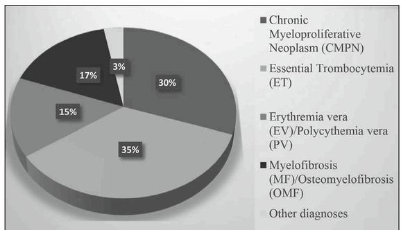Two hundred and thirty-two patients with chronic myeloproliferative neoplasms have been genotyped for their JAK2 V617F genotypic status. Eighty-two of 232 patients (35.4%) were diagnosed with ET, 35/232 (15.1%) PV/EV, 38/232 (16.4%) MF/OMF (osteomyelofibrosis), 70/232 (30.1%) chromic MPN and 7/232 (3.0%) with other hematological diseases (Figure 1). We performed analysis of the bone marrow biopsy samples of patients with MF/ OMF (38 individuals) and in 20 of them (52.6%) the initial diagnosis was confirmed. In six patients, the diagnosis was rejected based on the negative result of the biopsy sample (15.8%), five patients eventually proved to carry ET(13.2%),six had PV(15.8%) and one had MPN (2.6%).