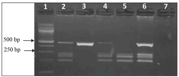 JAK2 V617F Mutation Detection by Restriction Analysis. Previously isolated DNA samples were amplified using JAK2 codon 617 mutation specific primers (V617F) (forward primer sequence: 5'-GGG TTT CCT CAG AAC GTT-3' and reverse primer sequence: 5 '-TCA TTG CTT TCC TTT TTC-3'). Amplifications were performed for 32 cycles with Taq polymerase (Qiagen Inc.), annealing temperature of 60 °C, and standard amplification conditions. Polymerase chain reaction (PCR) of the human JAK2 exon was performed as described by Baxter et al. [13]. The amplified 460 bp fragments were enzymatically digested using BsaXI restriction enzyme (New England Biolabs® Inc., Ipswich, MA, USA). Fragments of three different sizes (241, 189 and 30 bp) resulted after digestion of the wild type allele, the mutant allele remained undigested (Figure 2). Digested fragments were separated in 2.0% agarose gel. Visualization of the restriction fragments was achieved by ethidium bromide.