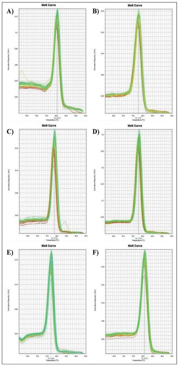 Melting (dissociation) curve analysis of the five HERV-encoded genes and the endogenous control used for normalization. A specific single peak was detected in the dissociation curves for all amplicons in every SLI and control sample. Panel A: HERV-K (HML-2) gag amplicons with a melting temperature 80.4 °C ± 1 °C. Panel B: HERV-K em with a melting temperature 77.7 °C ± 1 °C. Panel C: HERV-P em amplicons with a melting temperature 78.7 °C ± 1 °C. Panel D: HERV-R em with a melting temperature 77.9 °C ± 1 °C. Panel E: HERV-Wpo/ amplicons with a melting temperature 76.9 °C ± 1 °C. Panel F: GAPDH with a melting temperature 80.8 °C ± 1 °C.