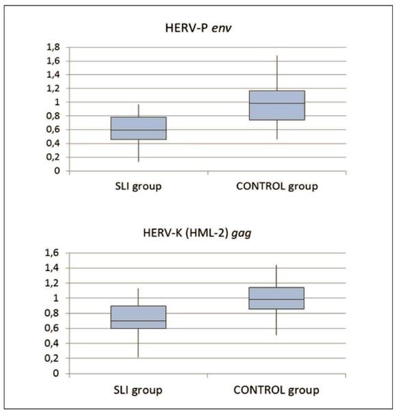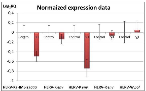 Differential expression of HERV in children with SLI (data presented in logarithmic scale). The qRT-PCR analysis of gene expression revealed that levels of HERV-K (HML-2) gag and HERV-P env were at least 1.4-times lower in the children with SLI compared to those in the control group (1.41- and 1.67-fold change for HERV-K (HML-2) gag and HERV-P env, respectively). Quantitative evaluation of the other three genes: HERV-K env, HERV-R env and HERV-W pol, found no significant changes in expression between the two groups.