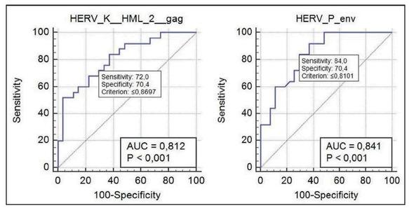 In order to determine whether the expression levels of HERV-K (HML-2) gag and HERV-P em can serve as potential discriminative biomarkers, we performed a receiver operating characteristic (ROC) analysis of the data from the qRT-PCR experiment. The ROC analysis is widely used statistical method for assessing the ability of a potential test marker to distinguish between disease carriers and healthy individuals. It provides a statistical model that presents the sensitivity (or the true positive fraction) of the marker as a function of the false positive fraction (defined as 1-specificity) of the same marker at multiple thresholds. Discriminative performance is