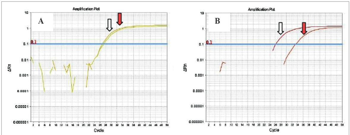 Results from the quantitative allele specific real-time PCR experiment in patients with 56.2% (A) and 5.5% (B) JAK2V617F mutation levels. The white arrow marks the normal allele and the red arrow the mutant allele.