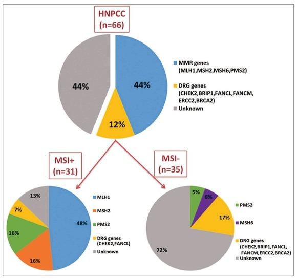Distribution of deleterious variants in 66 patients with HNPCC. The distribution of the mutations in different genes in the two subgroups of HNPCC patients divided by the MSI status of their tumors is also shown.
