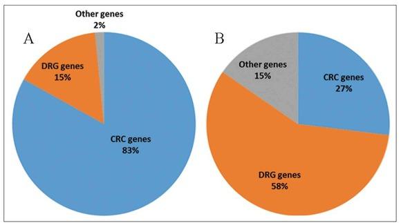Distribution of deleterious (A) and VUS (B) in known CRC genes (MLH1, MSH2, MSH6, PMS2, APC, MUTYH, NTHL1, BMPR1A, POLE), DRG genes (BRCA2, BLM, CHEK2, BRIP1, PALP2, FANCM, ATM, MRE11, FANCL, ERCC2) and other genes (FLCN, FH, KIT, CDH1, EZH2, CEP57, RUNX1).