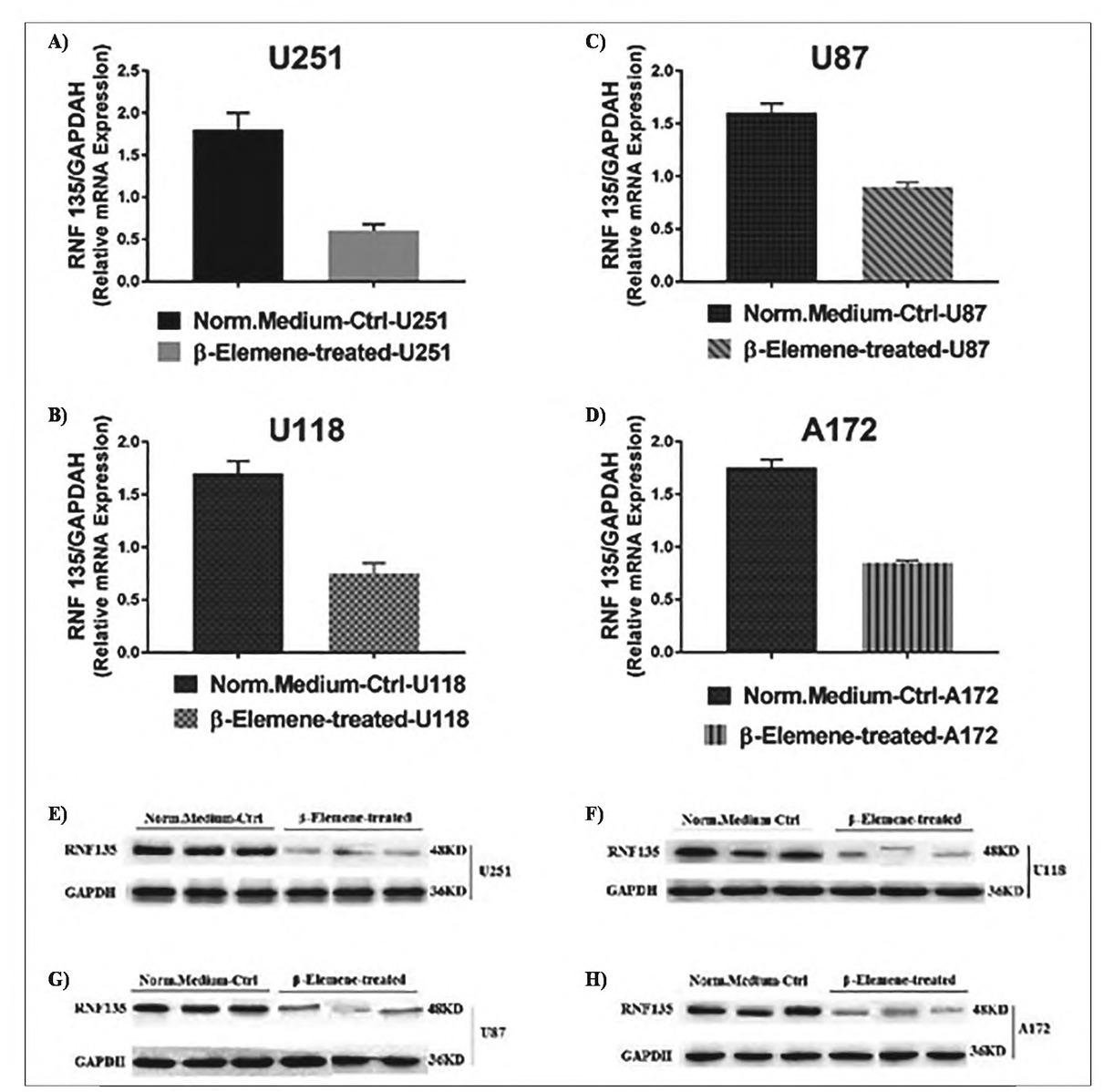 The expression level of RNF135 is suppressed in human glioblastoma cell lines U251, U118, U87 and A172 treated with β-elemene. The data from qRT-PCR (Author: see Abstract) of three independent experimental groups showed that the cell lines treated with β-elemene have a lower level of RNF 135 mRNA than the control group (p <0.05) (A-D). The data from Western blot also confirmed that protein levels of RNF135 were lower in the cell lines that were treated with β-elemene than those of the control group (E-H). Glyceraldehyde 3-phosphate dehydrogenase was used for both qRT-PCR and Western blot as loading control.