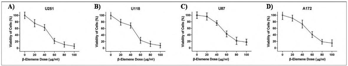 The Viability of Different Human Glioblastoma Cells Decreases with Increasing Doses of β-Elemene. The CCK-8 was utilized, based on the report of the manufacturer’s guidance, to test the effects of β-elemene on the proliferation of human glioblastoma cells. The U251, U118, A172 and U87 cells were treated with various doses of β-elemene such as 0.0, 20.0, 40.0, 60.0, 80.0, 100.0 μg/ mL over a time interval of 24 hours to obtain noticeable effects on the proliferation of the cells. The viability of the cell was shown as the percentage of control [Figure 2(A)-2(D)], and it was observed that the half maximal inhibitory effect (IC50) for each cell line was at different doses of β-elemene, such as 47.44 μg/mL for U251, 49.68 μg/mL for U118, 57.36 μg/mL for A 172 and58.41 μg/mL for U87.