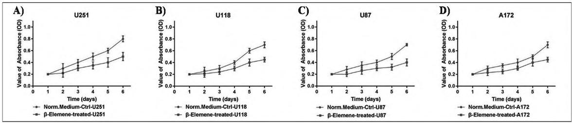 Increasing Time of Treatment with β-Elemene Results in Decreasing Viability of Different Cell Types of Human Glioblastoma. To determine the inhibitory effect of β-elemene on human glioblastoma cell lines in different time intervals we used CCK-8 based on the explanation mentioned in the Materials and Methods section. The U251, U118, A172 and U87 cells were utilized and 50.0 μg/mL of β-elemene was used for U251 and U118 cells and 60.0 μg/mL of β-elemene was used for U87 and A172 cells over a time interval of 0, 24, 48, 72, 96, 120, 144 hours. It was found that with increasing the time of treatment (we used IC50 dose for the cells), the viability of the cells decreases remarkably [Figure 3(A)-3(D)].