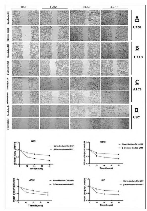 Migration of human glioblastoma cell lines U251, U118, A172 and U87 were inhibited by β-elemene. In this wound healing assay, 5000 cells/well were sown into 6-well plates, cultured and photographed at the time intervals of 12, 24, 36 and 48 hours in at least three independent groups (β-elemene treated vs. control groups). The data were analyzed as mean ± SD and p <0.05. The human glioblastoma cells treated with β-elemene was found to have much lower speed moving to the gaps compared to the untreated control group cells (A-D).
