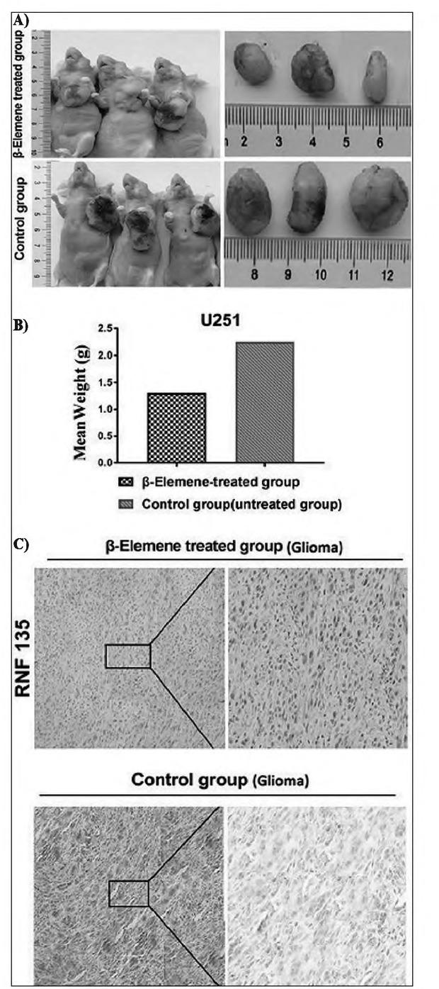 An earlier study from Feng et al. [21] showed that U87 results in tumorigenicity in the nude mice xenografts, and Zhu et al. [22] reported that β-elemene regulates the sternness of U87 cells. Our findings also agree with the earlier results, and we observed that U251 cells results in tumorigenicity in female nude mice and β-elemene suppressed the tumors formed in the mice by via suppressing the RNF135.
