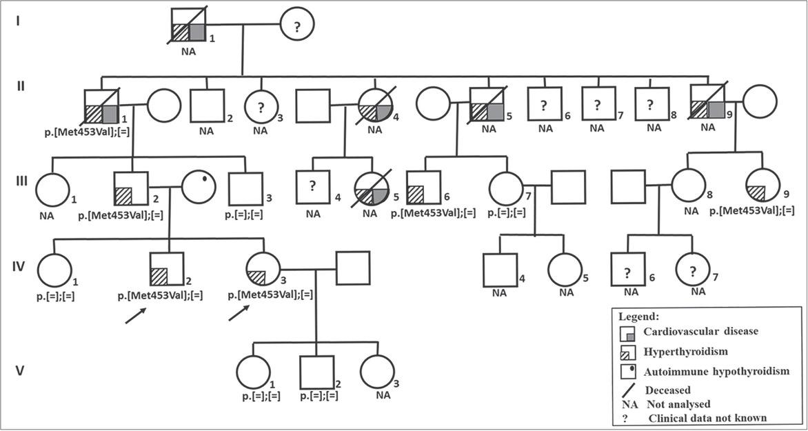 A family pedigree with clinical manifestations and observed TSHR gene disease-causing variant. The initially tested index patients are indicated by arrows. Variant in heterozygous state is marked as p.[Met453Val];[=], normal state is marked as p.[=];[=].