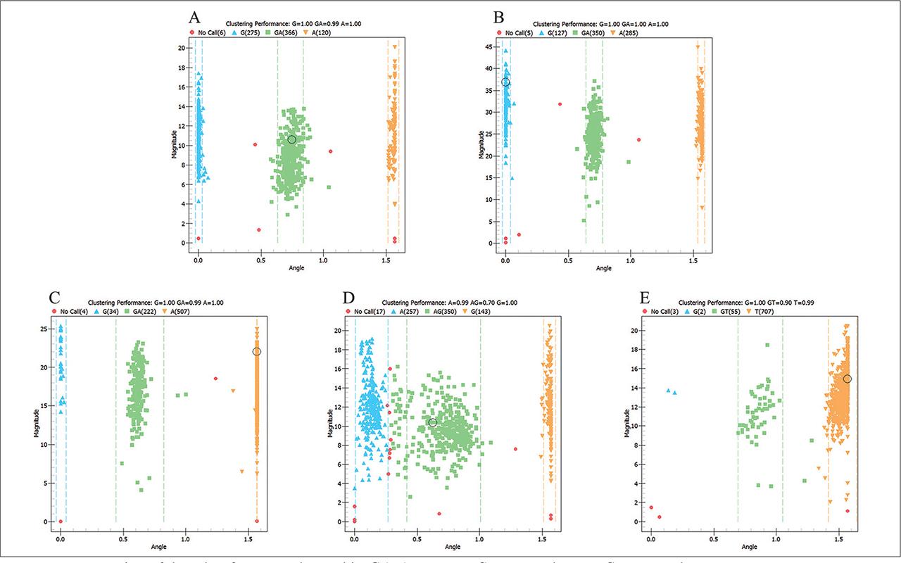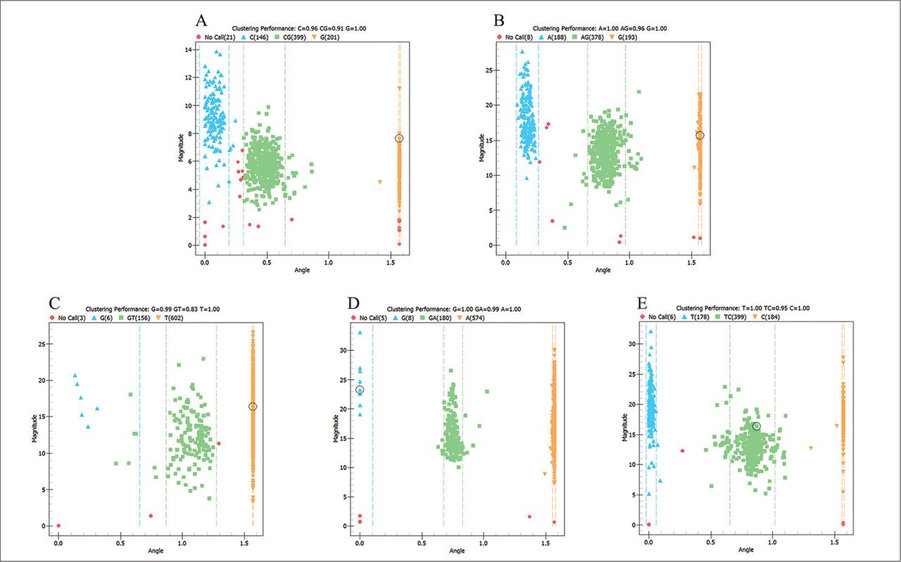 Genotyping of (A) GATA5: rs6061243 G>C, (B) TBX20: rs336283 A>G, (C) SMYD1: rs1542088 T>G, (D) MEF2C: rs80043958 A>G and (E) GATA5: rs6587239 T>C SNPs by MALDI-TOF-MS.
