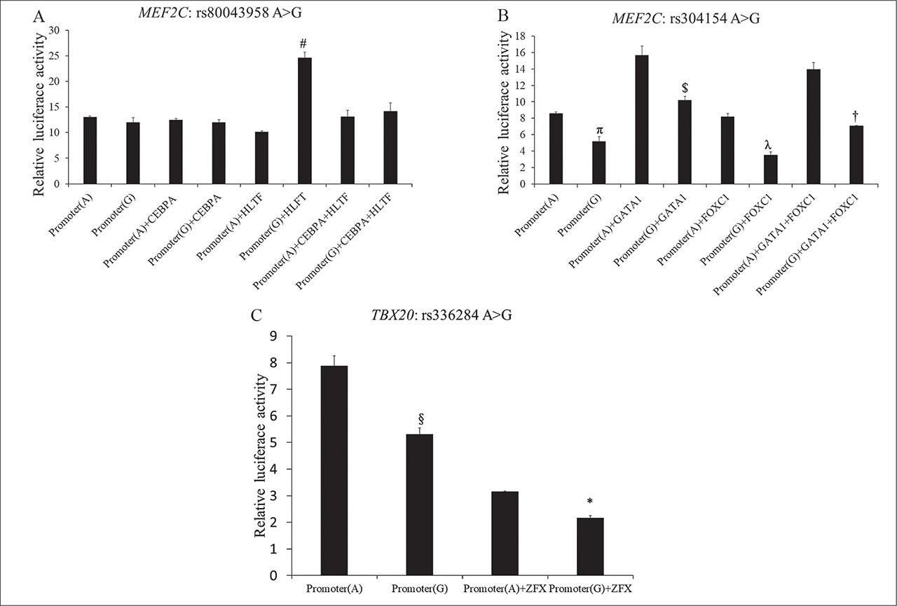 Luciferase assays of MEF2C: rs80043958 A>G, MEF2C: rs304154 A>G, and TBX20: rs336284 A>G