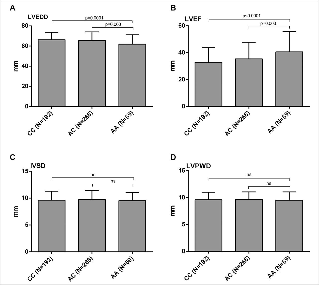 We attempted to explore the relationship between rs35006907 and clinical characteristics in DCM patients. As shown in Figure 1, patients carrying AA genotype displayed reduced LVEDD and increased LVEF when compared with CC (p=0.0001 for LVEDD and p<0.0001 for LVEF) and AC (p=0.003 for LVEDD and p=0.03 for LVEF) genotype. While no differences were observed in IVSD and LVPWD between different genotypes of rs35006907.
