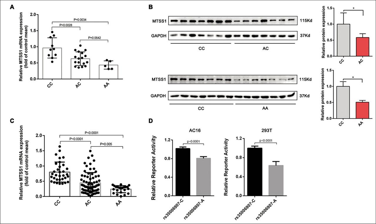 Firstly, we attempted to compare the MTSS1 expression among 3 genotypes of rs35006907 using human heart samples. The results indicated that MTSS1 mRNA level of CC genotype showed significantly higher than AC genotype (p=0.0028) and AA genotype (p=0.0034) (shown in Figure 2A). The difference between AC and AA genotypes had no statistical significance but showed a trend, probably owing to the limited samples. Furthermore, western blot results also demonstrated that CC genotype displayed increased protein expression when compared with the AC and AA genotypes (shown in Figure 2B).