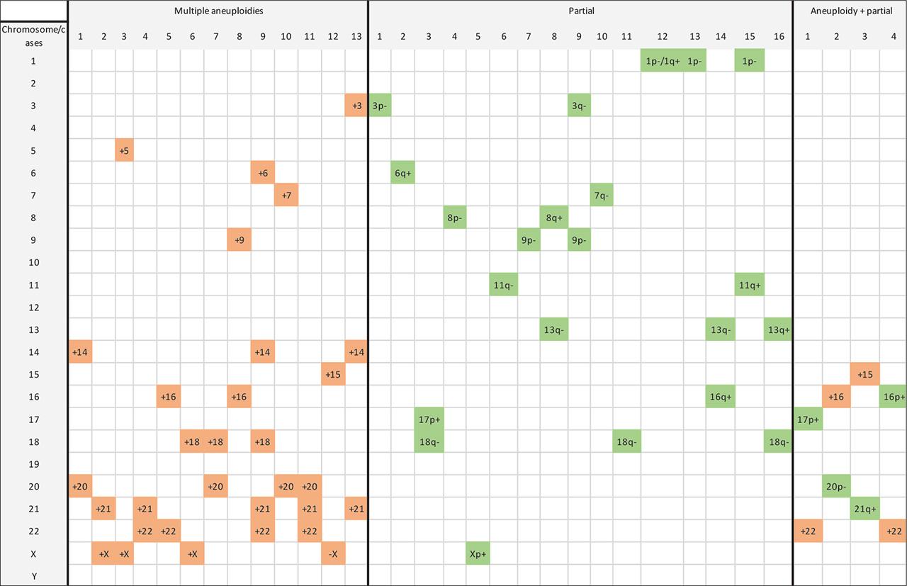 Partial chromosomal abnormalities (terminal deletions and duplications), multiple chromosomal aneuploidies, and chromosomal aneuploidies accompanied by partial chromosomal abnormality were found in 3.70%, 3.01%, and 0.93% of all positive samples (Table 2). A detailed description of the later three groups of chromosomal abnormalities is provided in Figure 2. Chromosomes 20, 21, 22 and X were most involved in multiple aneuploidies, chromosomes 1, 13 and 18 in partial aneuploidies, while chromosomes 15, 16 and 22 were found in combination with a partial aneuploidy. In cases of partial chromosomal abnormalities, parental karyotyping could not be performed at the time.