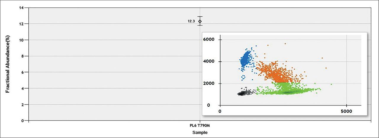 | SAMPLE NUMBER | NUMBER OF DROPLETS | WILD TYPE/MUTANT T790M | T790M MUTANT ALLELE FREQUENCY (%) | MUTANT CONC (COPIES/ML) |