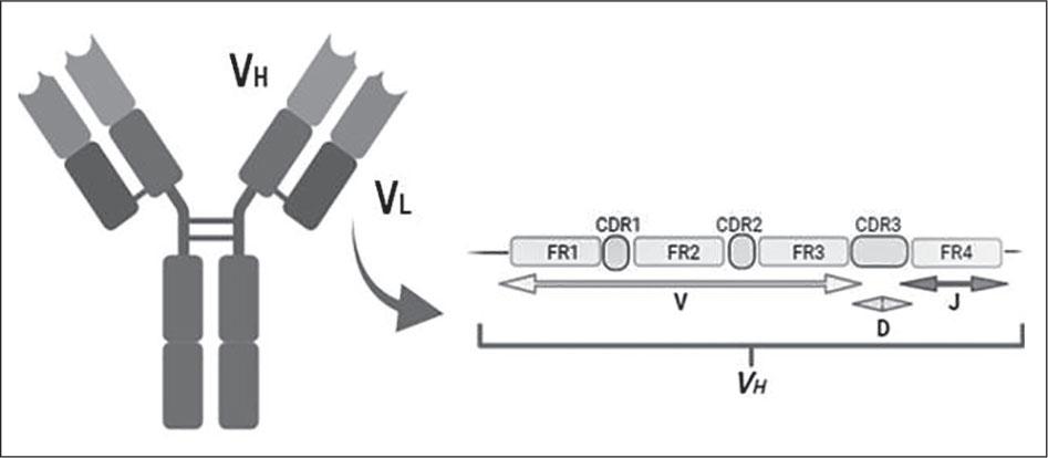 VH – variable region of heavy chain; VL – variable region of light chain; V – variable segment; D – diversity segment; J – junctional segment; CDR – complementarity-determining region; FR – framework region