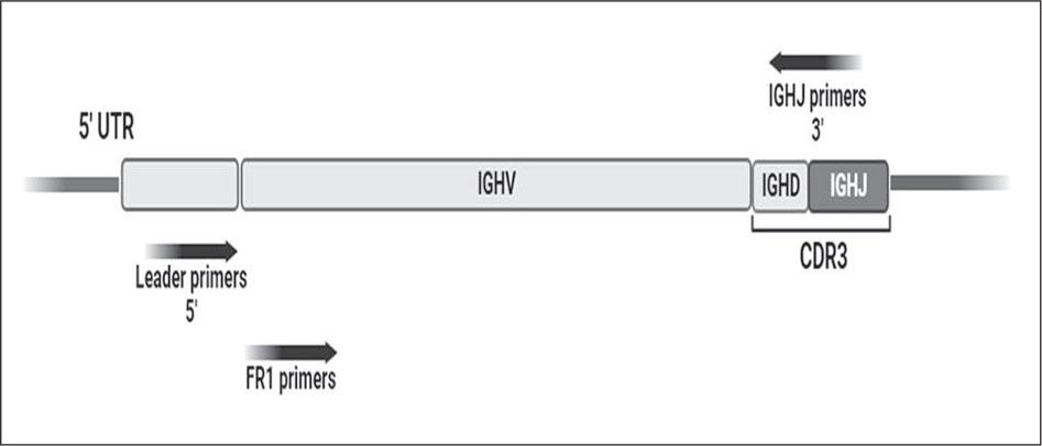 5′ IGHV Leader primers are located upstream of the IGHV coding sequence; 5′ IGHV FR1 (framework) primers are located within the rearranged IGHV gene; 3′ IGHJ primers are located at the end of the rearranged IGHJ gene; UTR – untranslated region