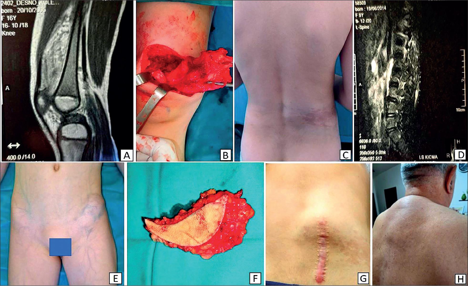 A Magnetic resonance imaging (MRI) of the thigh showing a tumor within the vastus lateralis and medialis muscles, Patient 1; B Intraoperative findings during excision of the tumor from the medial aspect of the distal thigh, Patient 1; C Tumor in the left inguinal region, Patient 1; D Completely excised tumor from the left inguinal region, Patient 1; E Tumor located in the left paraspinal region, Patient 2; F Magnetic resonance imaging (MRI) of the lumbar region reveals a paraspinal lipomatous lesion involving the musculature and aponeurotic structures, Patient 2; G Tumor recurrence in the left paraspinal region at the site of the postoperative scar, Patient 2; H Presence of subcutaneous soft tissue tumors in the siblings’ grandfather, Patient 4.