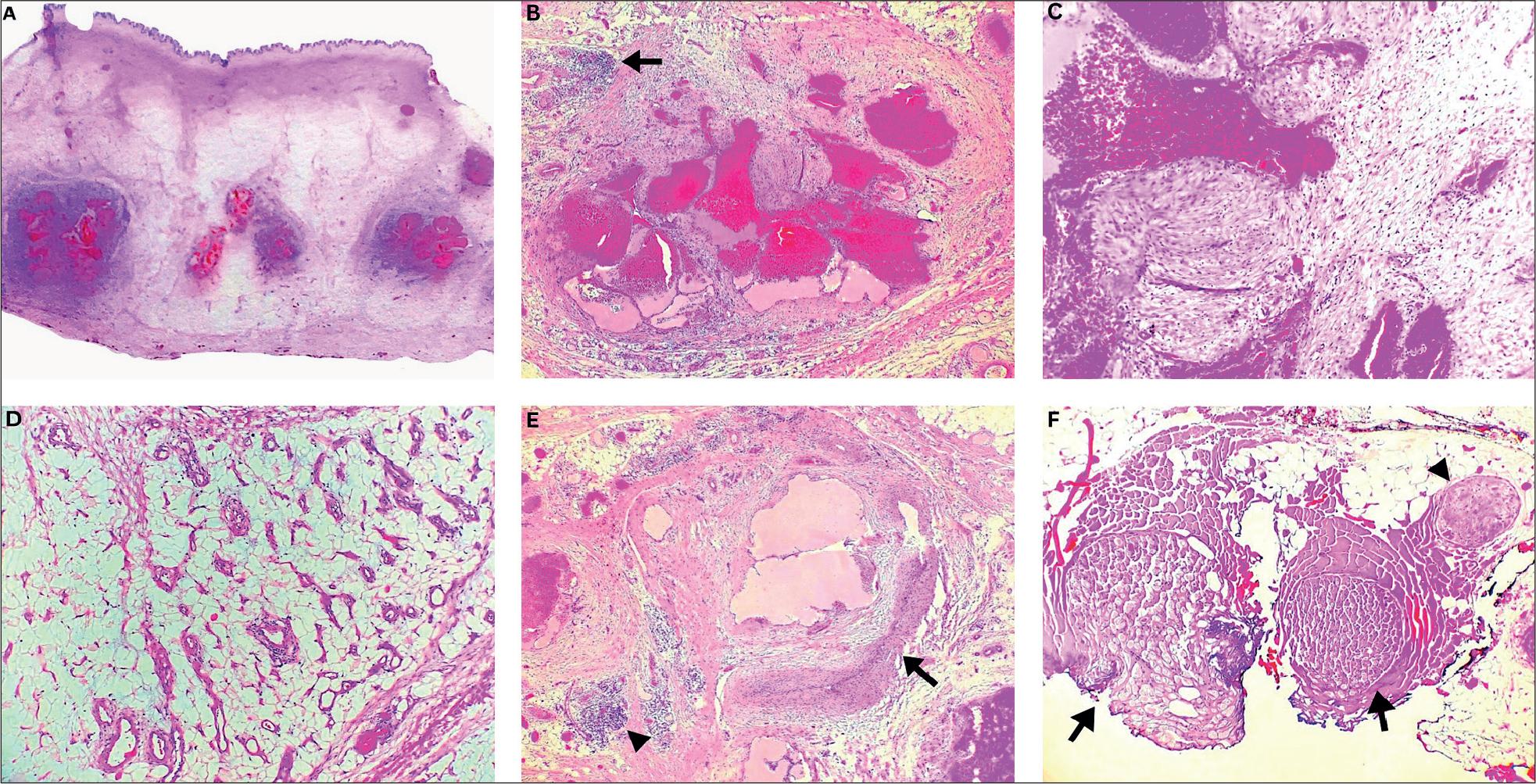 A. At scanning magnification the lesion were composed of a variable admixture of adipose tissue and abnormal vessels; B.Dominant adipocytic component containing clusters of back-to back thin-walled veins and lymphocytic aggregate (arrow); C. Fibromyxoid stroma in vascular clusters; D. Indeterminate small vessels reminiscent of veins dispersed within adipose tissue; E.Arterial component with coiled thick-walled artery with tiny lumen (arrow) and lymphocytic aggregate (arrowhead); F.Hypertrophic nerves within lesion (arrows) compared to normal looking nerve (arrowhead).