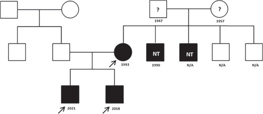 Informed consent for genetic testing was obtained from the mother. Whole exome sequencing (WES) analysis for the mother and her two sons was performed on DNA extracted from peripheral blood cells. Library preparation for WES analysis was done using the Twist Human Core+RefSeq+Mitochondrial Panel (Twist Bioscience, San Francisco, California, USA) and sequencing reads were generated by Illumina Nova Seq 6000 instrument (Illumina Inc., San Diego, California, USA). Enriched fragments were sequenced as paired-end reads (2x101bp). Sequencing and bioinformatics analyses for mapping the sequenced fragments and calling the variants (with interval padding of 30bp on both sides of the targeted regions) were performed at an accredited Referral Laboratory – CeGaT GmbH, Tübingen, Germany.