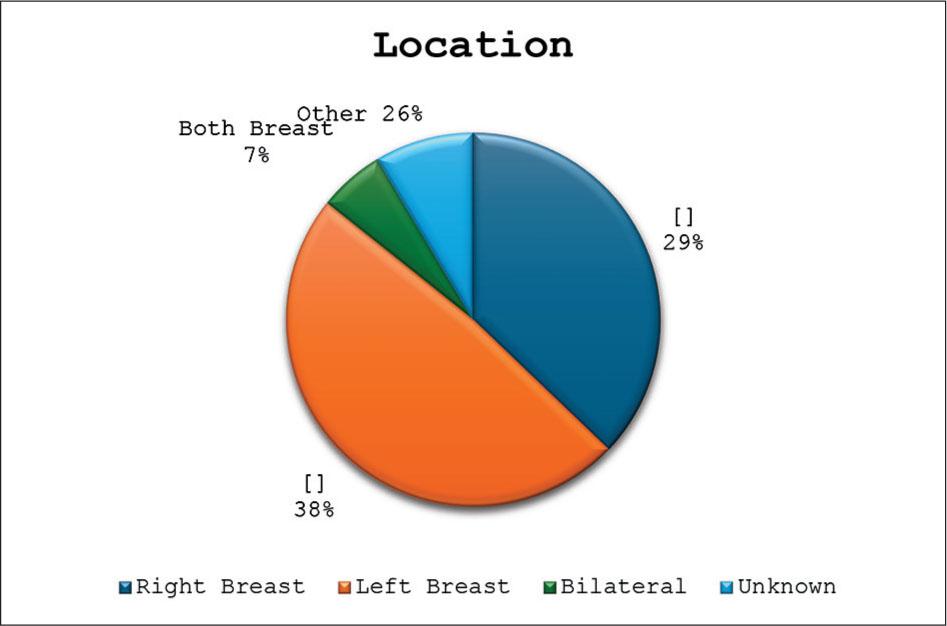 Distribution of the tumor location. 38% (34 patients) had a tumor on their left breast alone, 29% (26 patients) had a tumor on their right breast alone, and 7% (six patients) bilateral.