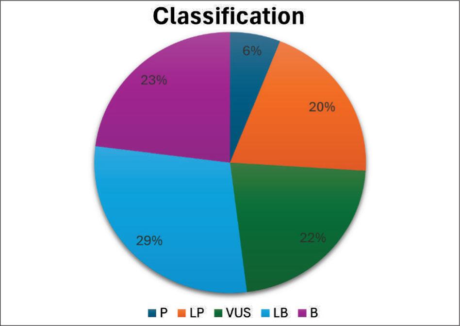 Gene variant distributions according to ACMG categories (P: pathogenic, LP: likely pathogenic, LB: likely benign, B: benign, VUS: variant with unknown significance).
