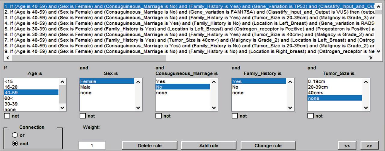 In order to create a scoring system for breast cancer estimation utilizing family history, TNM stage, and BC class as risk variables, the fuzzy logic system was recently employed to predict the mortality of breast cancer [15]. An assessment of breast cancer risk was carried out in a different study by Valarmathi et al. (2012). The staging of lymph nodes, tumors, and metastases was done using the Unity rule and the ID3 algorithm. The fuzzy logic toolbox was used to estimate the intensity range of breast cancer. The factors included diagnosis stages such as TNM, gender, age, diet, location, year, heredity, marital status, disease phase, and therapy [16]. However, according to ACMG guidelines [10], this study concentrated on 18 inherited risk factor genes: CHEK2, TP53, FAM175A, NBN, MSH6, APC, RAD50, MSH2, ATM, CDH1, MUTYH, PALB2, BART1, BLM, MRE11A, PMS2, PTEN, and BRIP. Data were categorized into 15 distinct input clusters representing cancer-associated risk factors, such as age, sex, family history, consanguinity, relativeness degree, lymph node, malignancy, location, tumor size, gene, progesterone positivity, estrogen receptor positivity, gene variation, classification, and diagnosis. In addition to their genetic variants, which are believed to be connected to the molecular etiology of breast cancer.