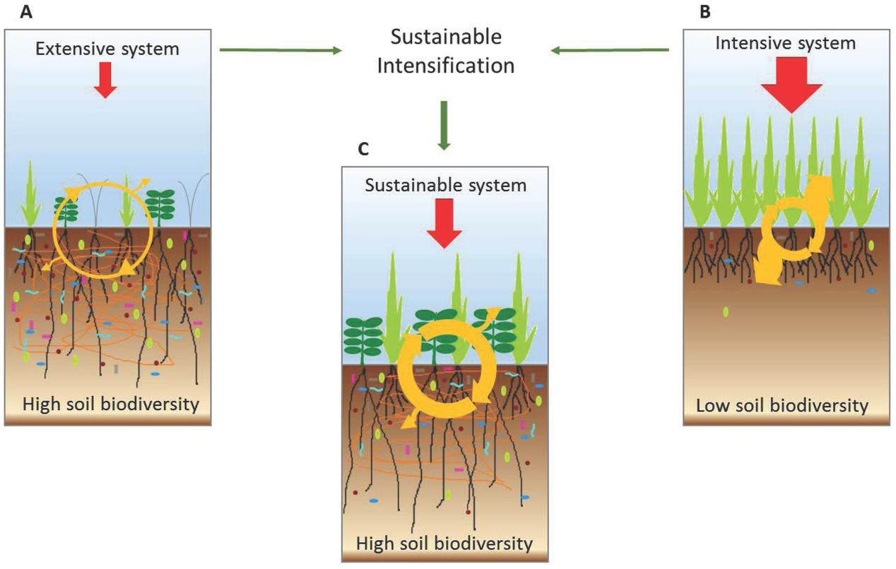 Intensive agricultural systems are characterized by a higher resource input than extensive systems, but this type of intensification is often accompanied by focalization on few crops or even monocultures and by heavy use of fertilizer and pesticide (Figure 1). This, in turn, reduces soil biodiversity and threatens ecosystem functions in the long run. A more ecological approach seeks to keep soil biodiversity high, reduce nutrient losses from the system, and improve nutrient use efficiency rather than simply increasing the amount of nutrients supplied externally (Figure 1).
