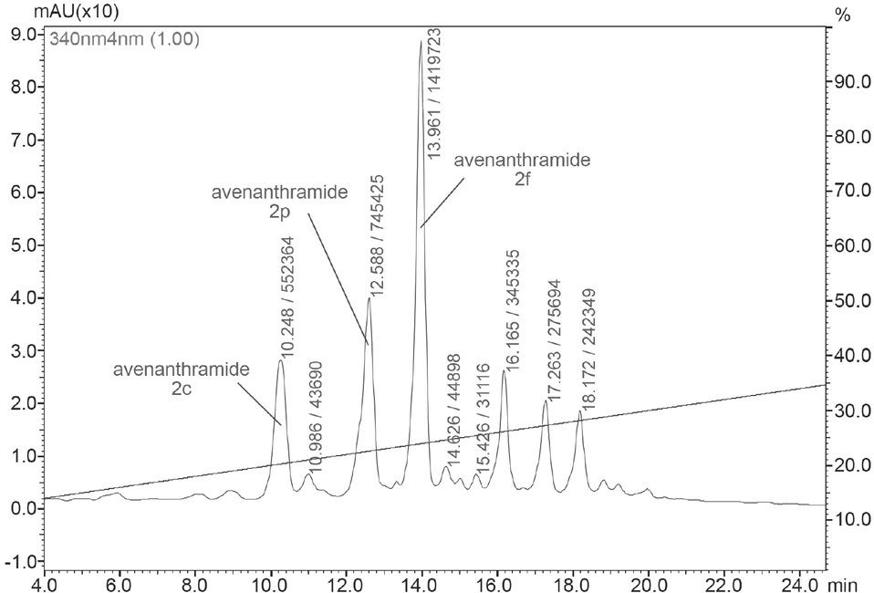 Contents of avenanthramides 2p, 2f and 2c, and the total amount of these avenanthramides in mg/100 g dry matter_ Analysis was performed in duplicates_Tabelle 4_ Gehalte an den Avenanthramiden 2p, 2f und 2c und der Gesamtgehalt an diesen Avenanthramiden in mg/100 g Trockensubstanz_ Die Analyse erfolgte in Duplikaten_