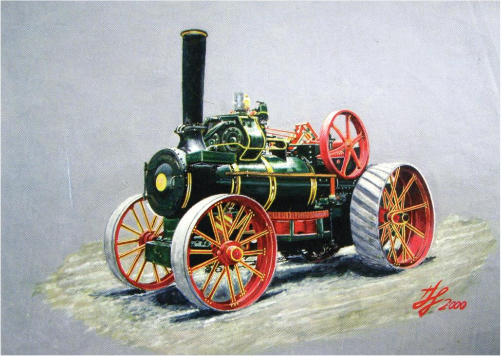 Abbildung 6. Lokomobile Kemna (Deutschland), mit Seilwinde zum Dampfpflügen, gemalt von Dušan Jejčič 2000 (Jejčič, 2010)